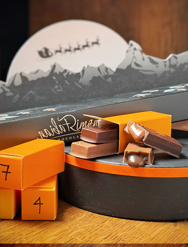 In diesem Jahr enthält der Genusskalender eine Premiere: die neuen «FlowBites». Ein süsser Genuss mit flüssigem Kern, umhüllt mit einer dünnen Schicht feinster Schokolade. Die FlowBites gibt es in zwölf unterschiedlichen Geschmacksrichtungen. Sie werden im Verlauf des nächsten Jahres auch bei uns im Laden erhältlich sein.