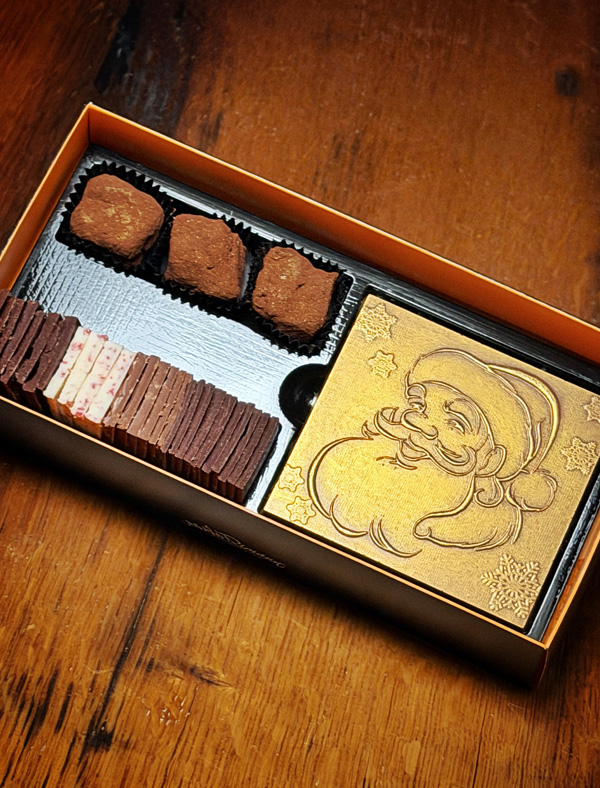 Haben Sie Ihr Sprüchli schon bereit? Denn der Samichlaus hat bei uns Einzug gehalten. Statt dem klassischen Samichlaussäckli gibt es bei uns auch eine Geschenkbox mit Milch-Tafelschokolade (mit Nougat und Mandarine), drei Goldstücken und einer Auswahl assortierter Schoggiplättli.