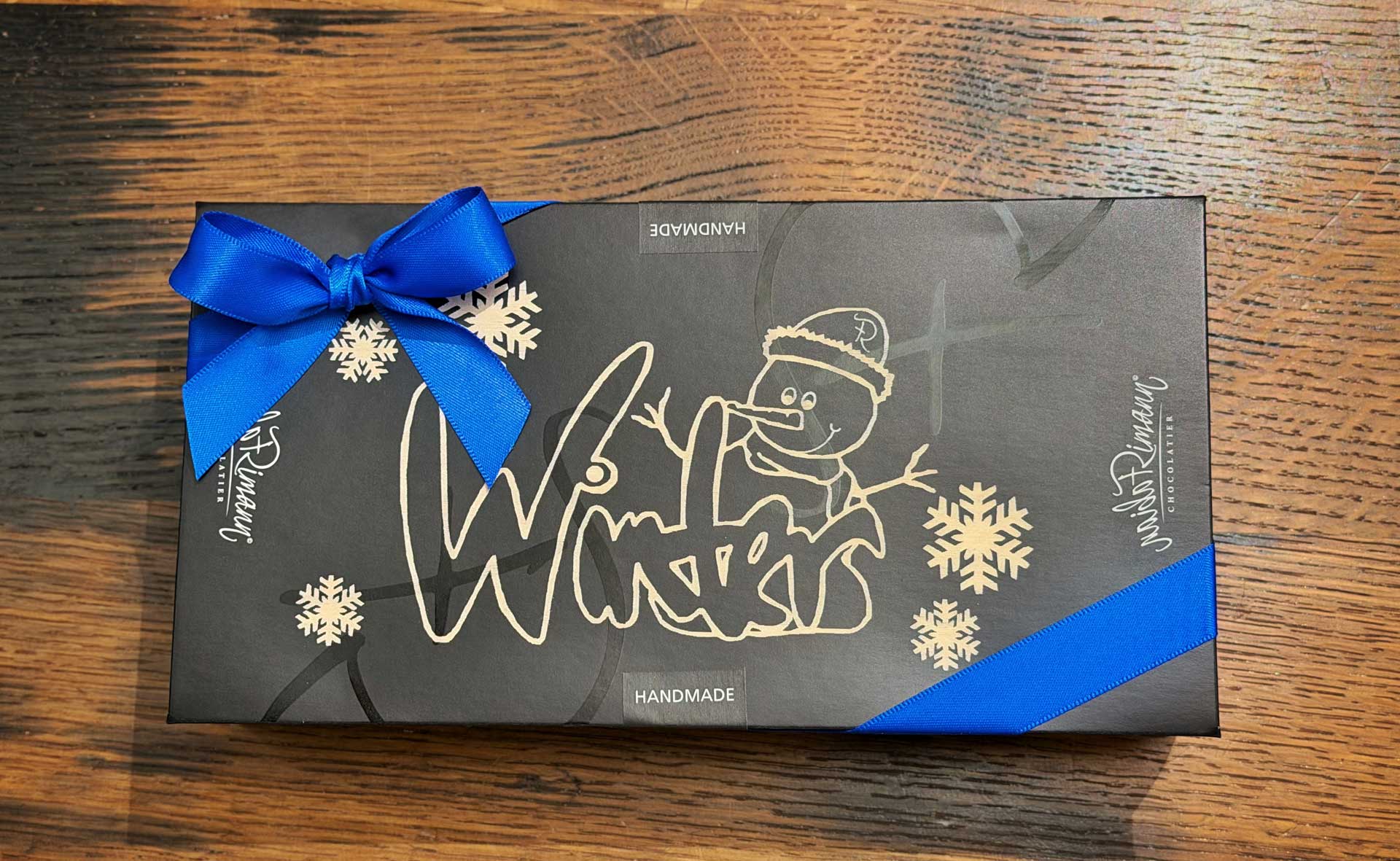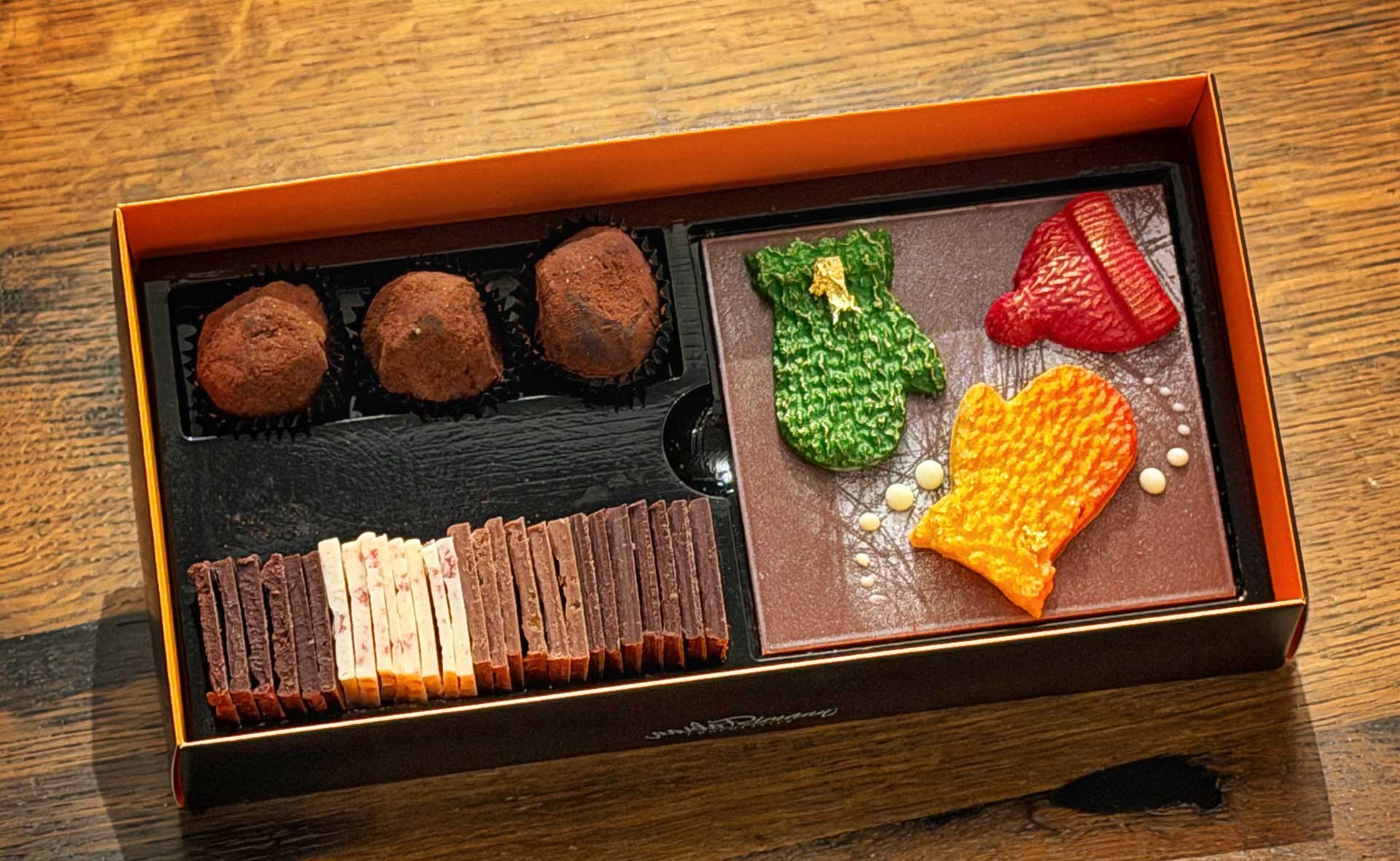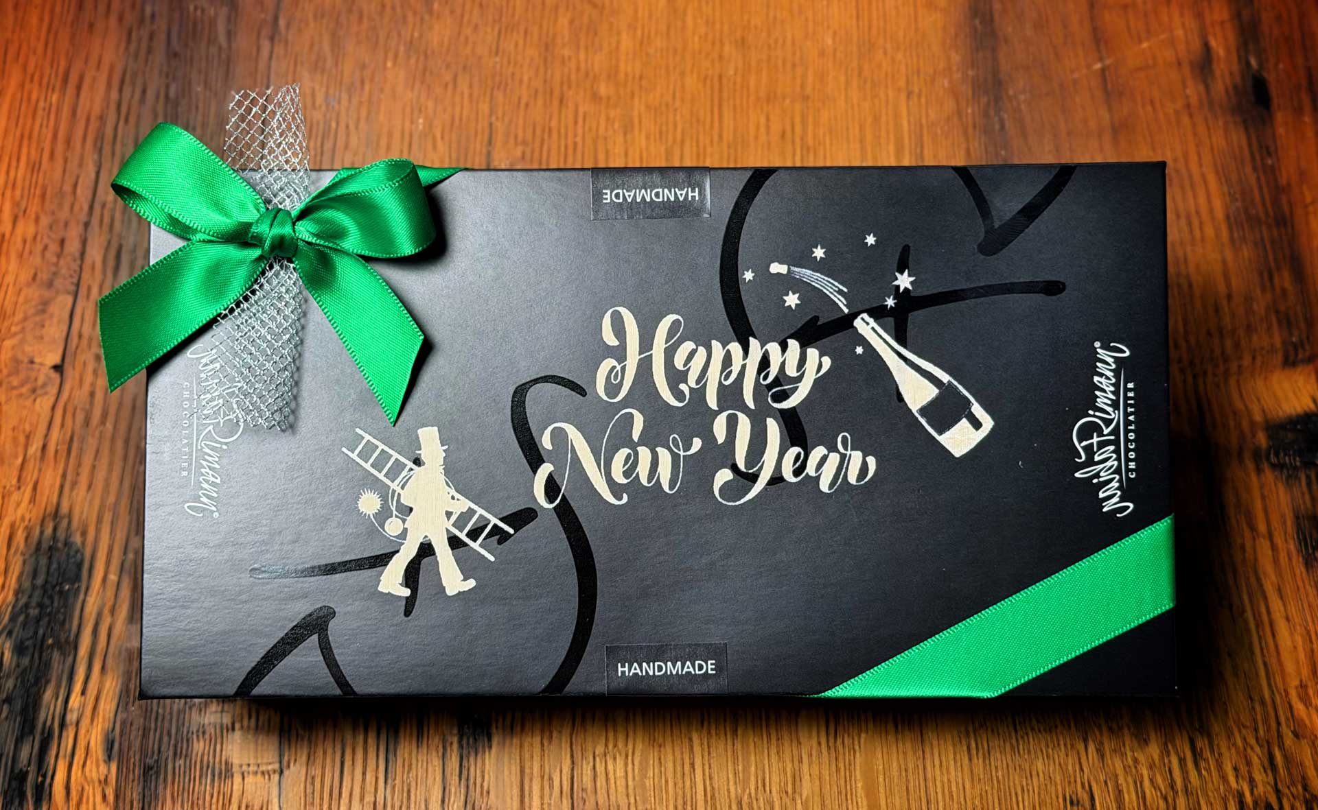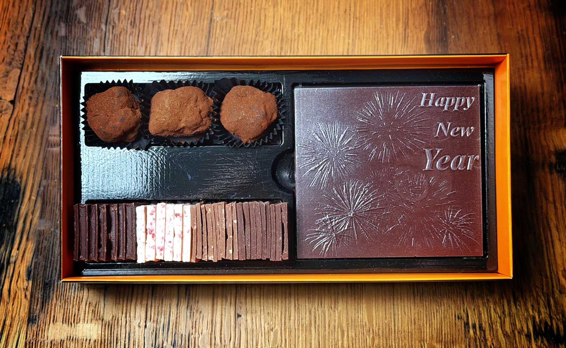 Ein schokoladiges Feuerwerk! Die Neujahrsbox enthält eine Tafel dunkle Schokolade sowie drei Goldstücke und eine Auswahl assortierter Schoggiplättli.