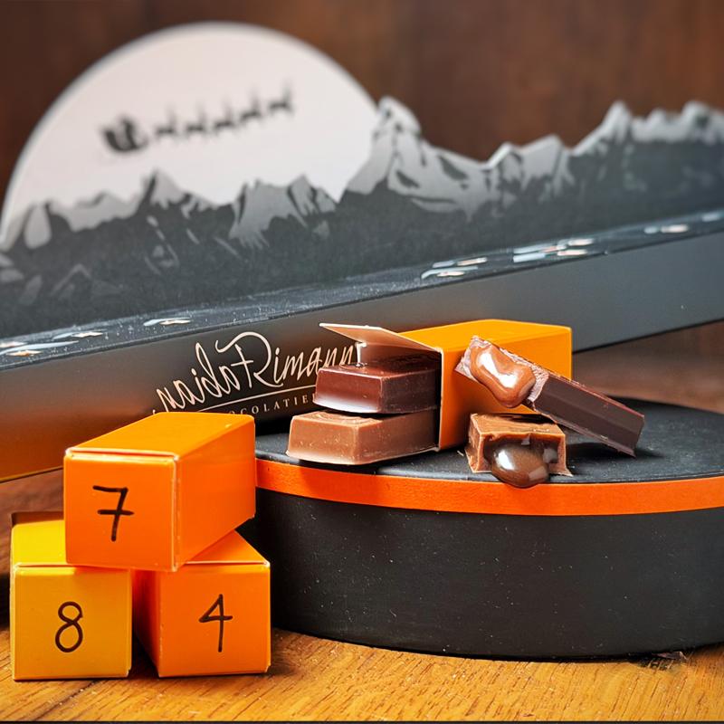 Der Kalender enthält 24 kleine Schächtelchen, jedes gefüllt mit einer anderen süssen Verführung aus unserem Hause. Zum ersten Mal und als Premiere mit einer grossen Auswahl «FlowBites». Eine süsse Verführung mit flüssigem Kern, überzogen mit einer dünnen Schicht Milch- oder dunkler Schokolade. Die FlowBites gibt es in zwölf unterschiedlichen Geschmacksrichtungen wie Passionsfrucht, Salz-Caramel oder Gianduja. Lassen Sie sich überraschen. Ab 2026 werden wir die «FlowBites» als neue Produktelinie in das Sortiment aufnehmen.